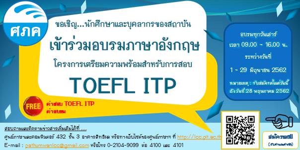 ข่าวล่าสุด ภาษา หลักสูตรอบรมภาษาอังกฤษเพื่อเตรียมความพร้อมสอบ TOEFL ITP April 30, 2019May 6, 2019 admin เปิดรับสมัครแล้วจ้าาาา “โครงการเตรียมความพร้อมสำห รับการสอบ TOEFL ITP” ศูนย์ภาษาฯของเชิญชวนให้พี่ ๆน้องๆนักศึกษาและบุคลากรขอ งสถาบันฯ สมัครเข้าร่วมอบรมภาษาอังกฤ ษแบบฟรีๆ ไม่มีค่าใช้จ่ายนะจ๊ะ สมัครที่นี่